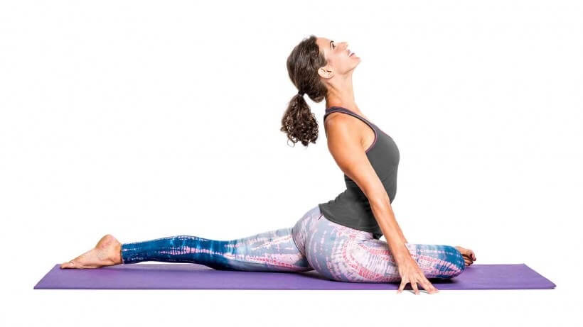 Sitt på golvet med höfter och rygg i 90 graders vinkel från golvet. Ena benet ska vara framåtsträckt och böjt in mot kroppen vid knät. Det andra benet sträcker du rakt bakåt. Pressa överkroppen framåt och försök hålla kvar ställningen i en minut. Upprepa sedan proceduren med andra benet.